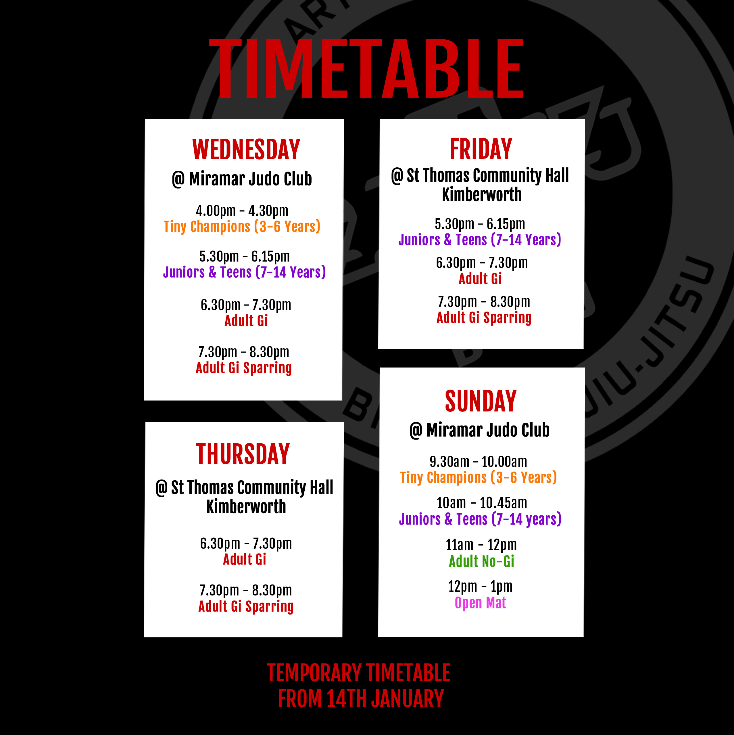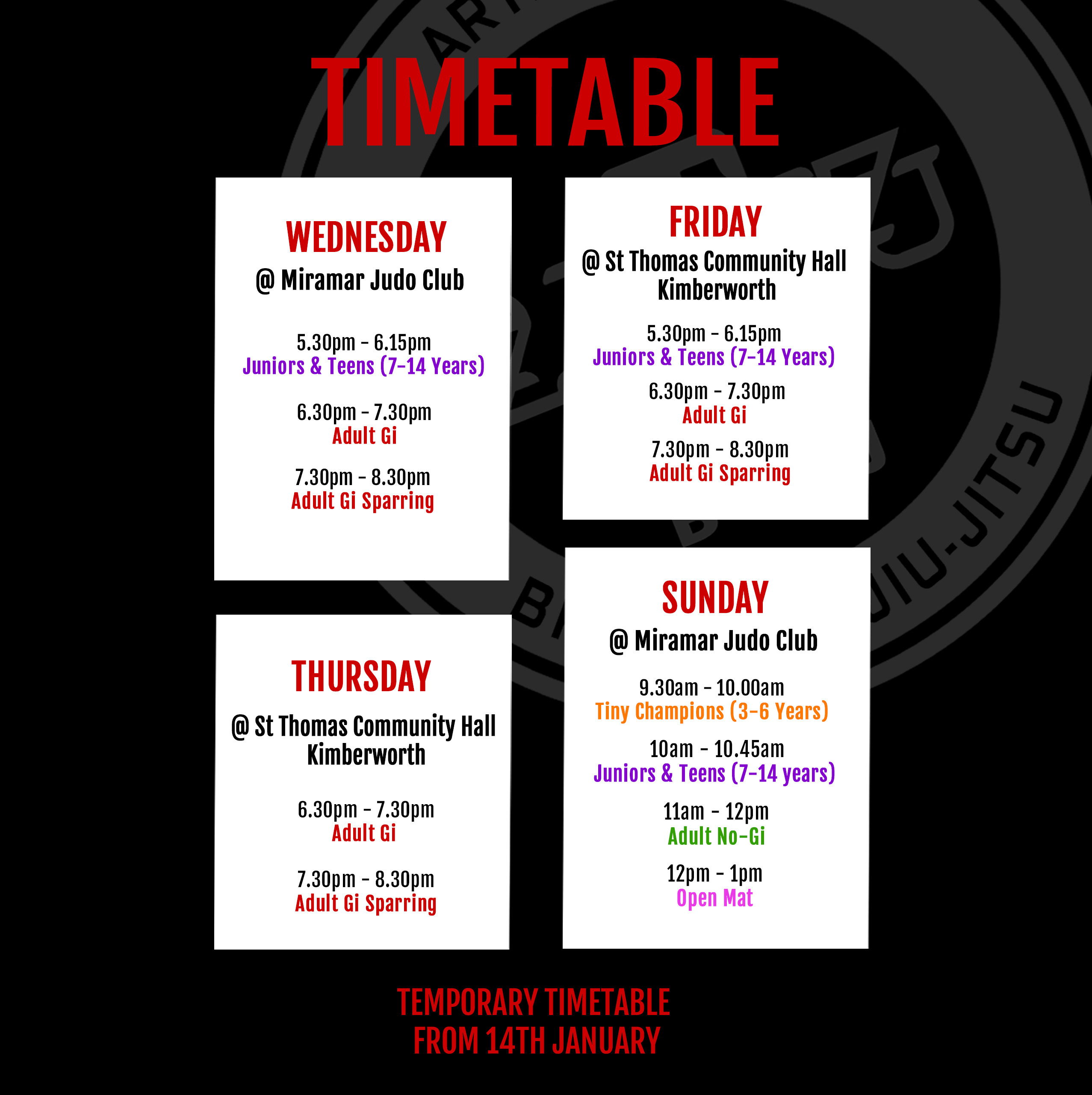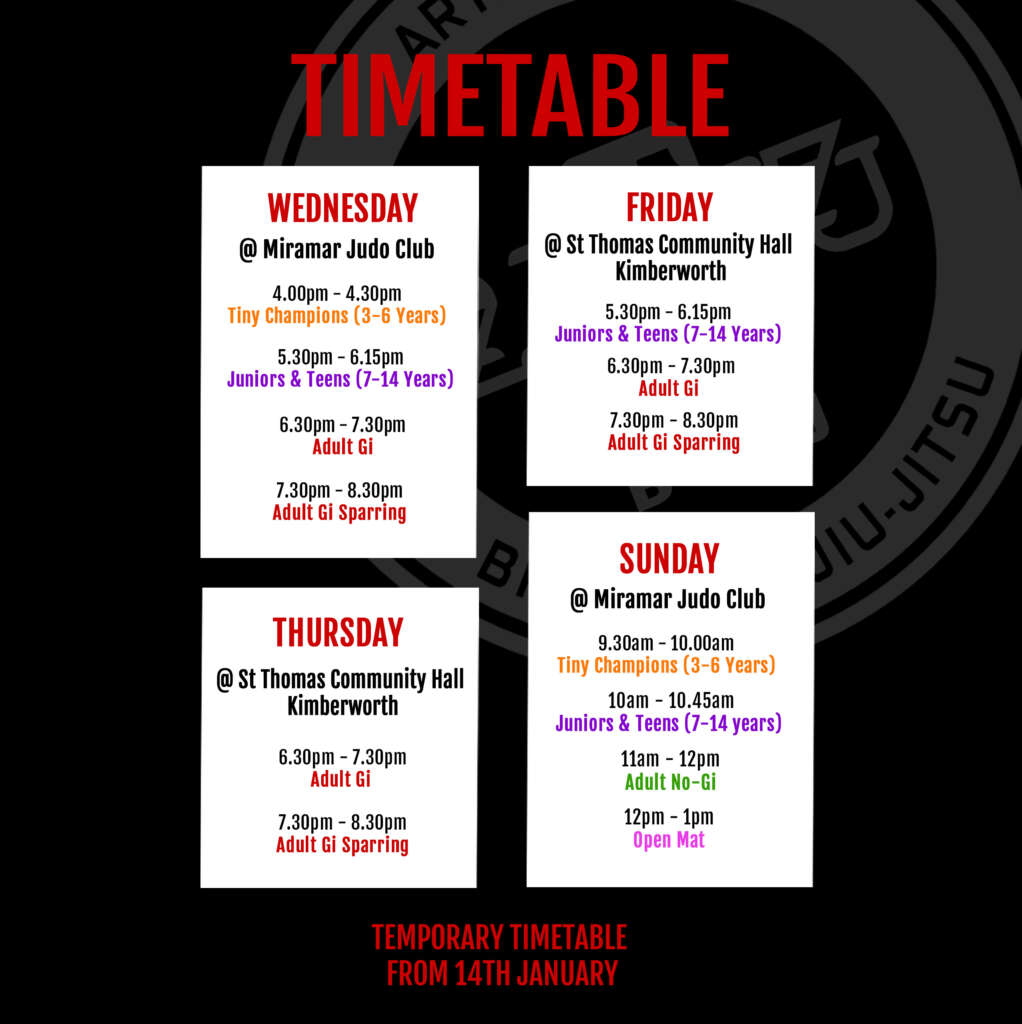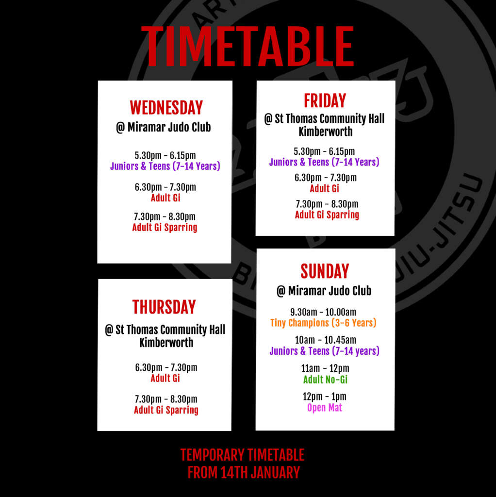 While our brand-new gym is being renovated, we’re running a temporary timetable. New starters are still very welcome, with training taking place in our temporary facilities. Get in touch for more details—we’d love to hear from you!